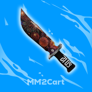 2015 is a common knife that was originally obtainable by redeeming the code "2015." Since the code has expired, it can now only be acquired through trading. The blade features a dark brown base decorated with multicolored fireworks.